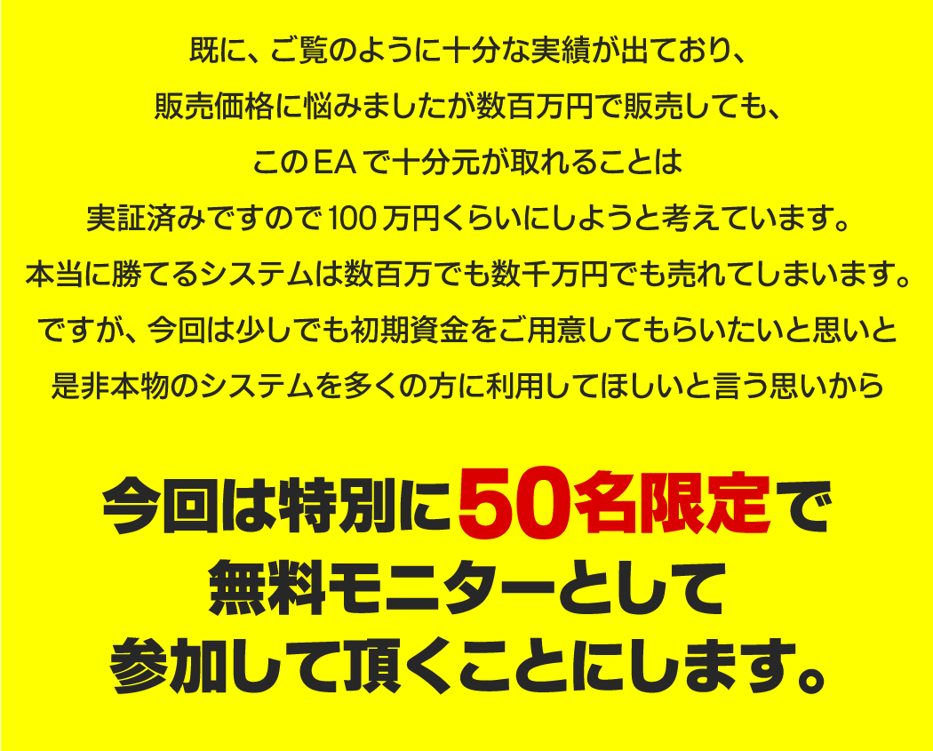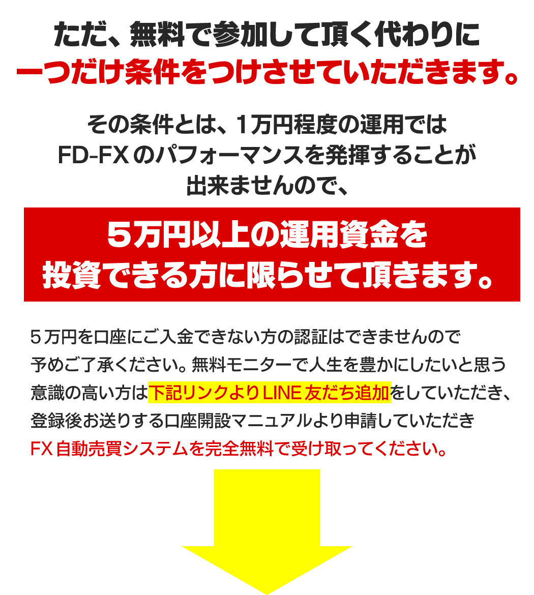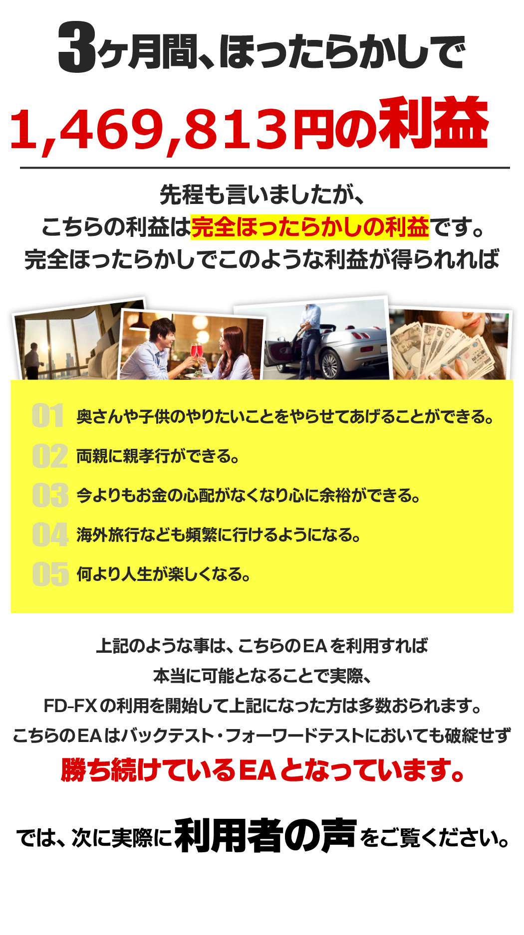 運用資金が100~300万円ある場合は、損少利大(損切りを結構します。そのためマイナスの日も多少はありますが、利益をあげるときは他のFD-FXシリーズのツールよりかなり大きい数字をたたきだします。)のFD-GTHを試してみるものいいです。